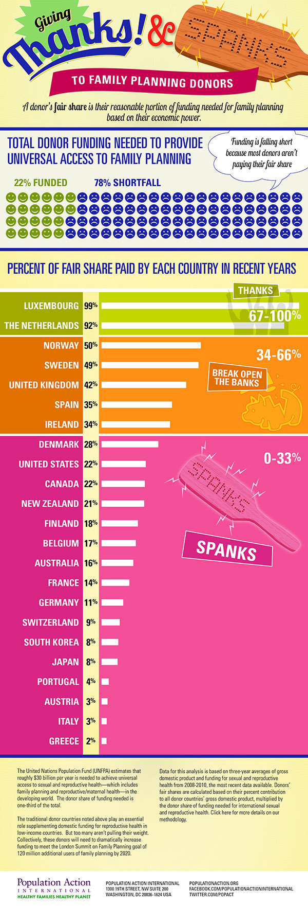 For our latest infographic, we compared each donor’s actual funding for family planning and reproductive health to their fair share of funding. Then we ranked them based on how close they come to meeting their fair share. Rankings can be very telling: only two countries—Luxembourg and The Netherlands—even come close to meeting their fair share of funding for family planning and reproductive health. We “Thank” them for leading the way.