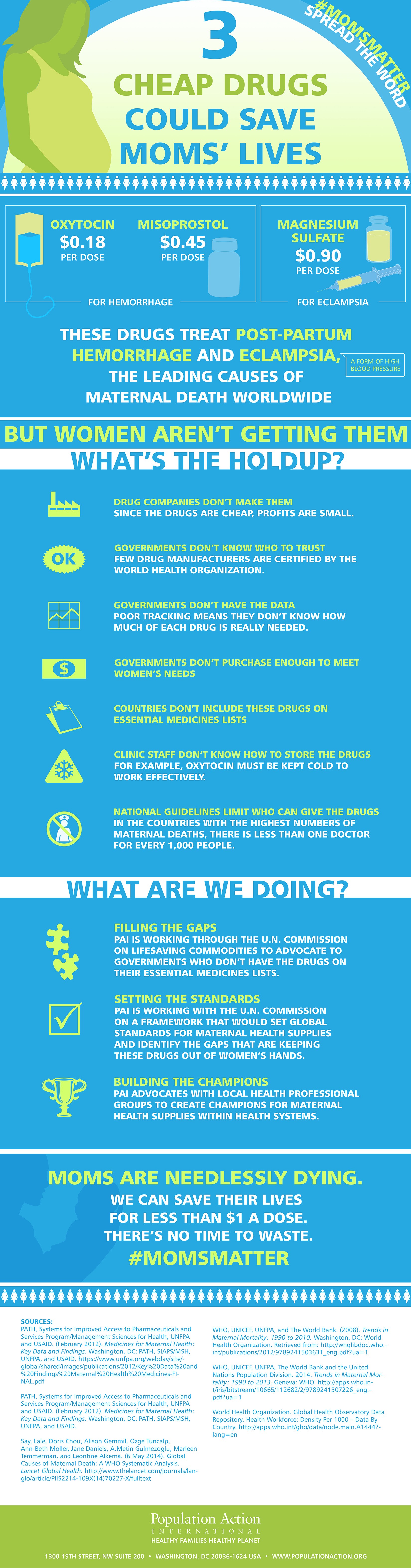 In our first #MomsMatter infographic, we told you we have a problem. A big one. Every two minutes, 800 mothers die in pregnancy of childbirth, and almost all these deaths take place in the developing world. Three cheap drugs could save these mothers’ lives, but the drugs aren’t making it into the hands of the women who need them.